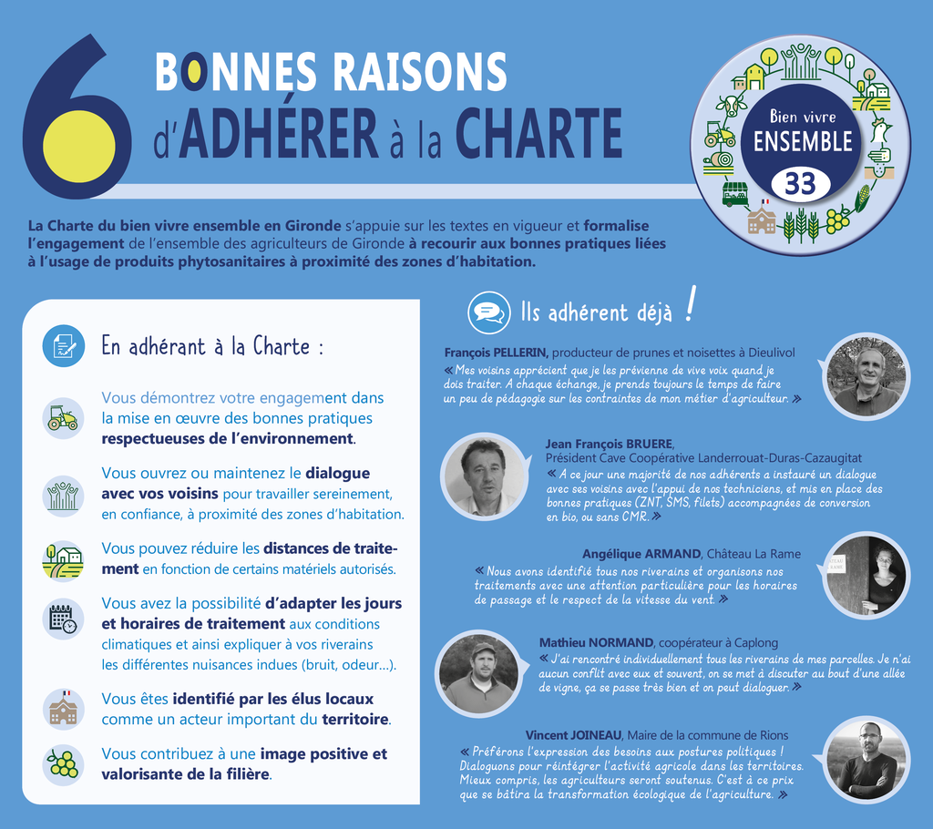 La Charte du bien vivre ensemble en Gironde établie par la Chambre d’Agriculture de la Gironde avec toutes les filières, les organisations professionnelles et l’association des maires, a été validée par la Préfète de la Gironde le 29 juin 2020.