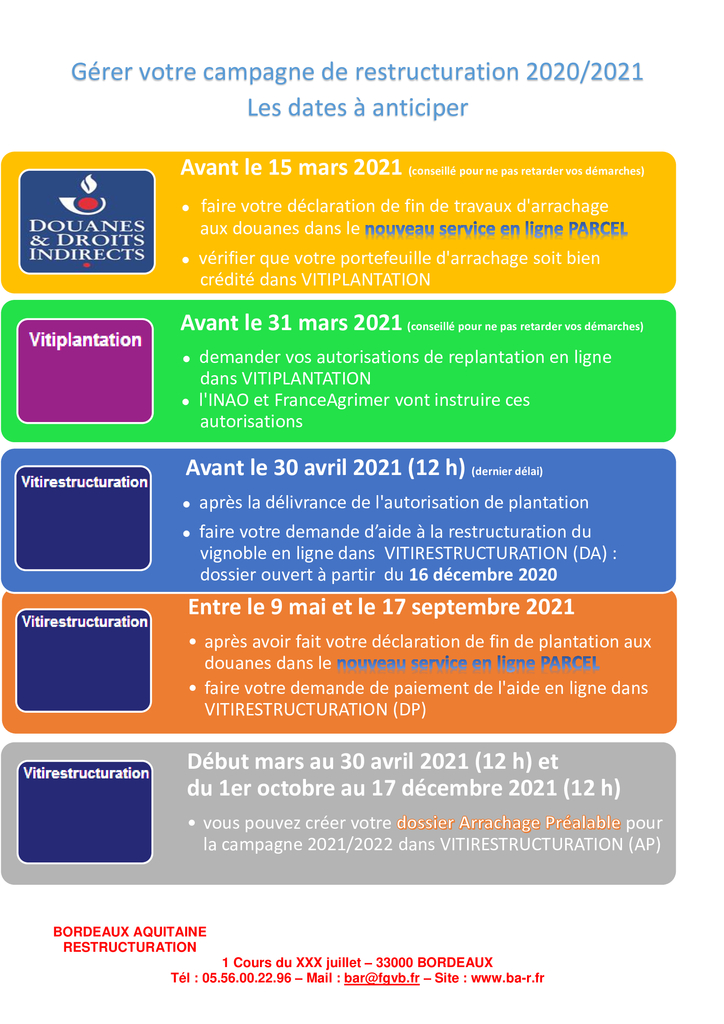 Pour des opérations à réaliser au cours de la campagne 2020-2021 (plantation et/ou palissage), les viticulteurs doivent déposer leur dossier dématérialisé de demande d’aide à la restructuration entre le 16 décembre 2020 et le 30 avril 2021 à 12h00 dans VITIRESTRUCTURATION. Après ce délai plus aucune demande ne sera possible.